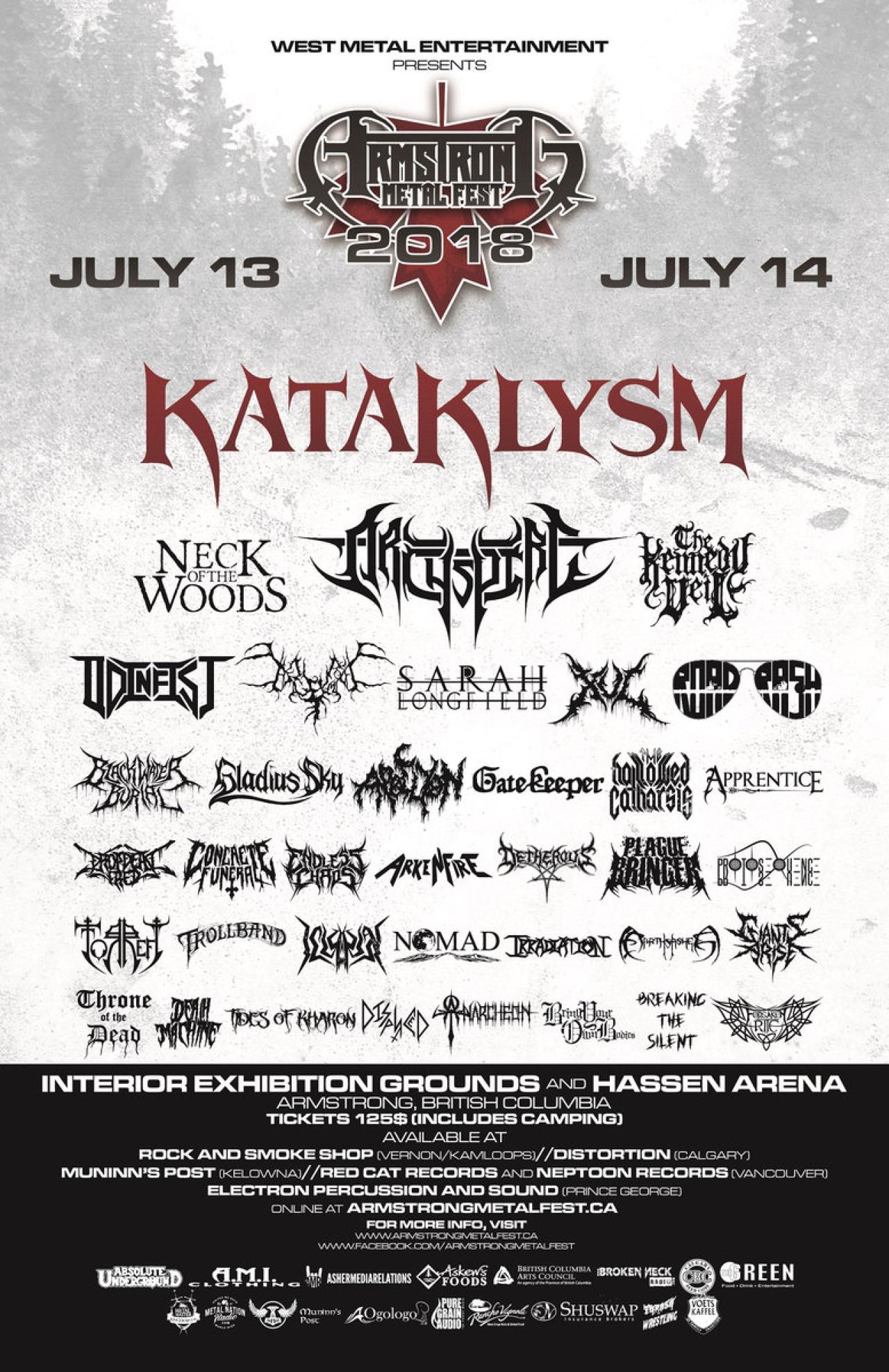 What first began as a backyard show has now grown into one of Western Canada's best mountain moshpits in British Columbia's Okanagan Valley. Reaching its 10 year milestone, Armstrong MetalFest is now anchored as one of the largest gatherings of metalheads from across Western Canada and beyond. The 2018 line-up features over 30 bands with  headliners  KATAKLYS M, SARAH LONGFIELD, ARCHSPIRE, THE KENNEDY VEIL, NECK OF THE WOODS  and more  performing on July 13th and 14th at the Hassen Arena in Armstrong, BC.