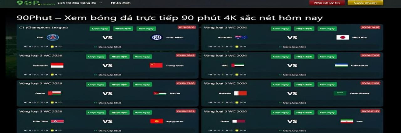 90phut là website phát trực tiếp bóng đá hàng đầu Việt Nam, chất lượng hình ảnh cao. BLV tiếng việt các giải bóng đá Anh, Laliga, C1, Euro,...