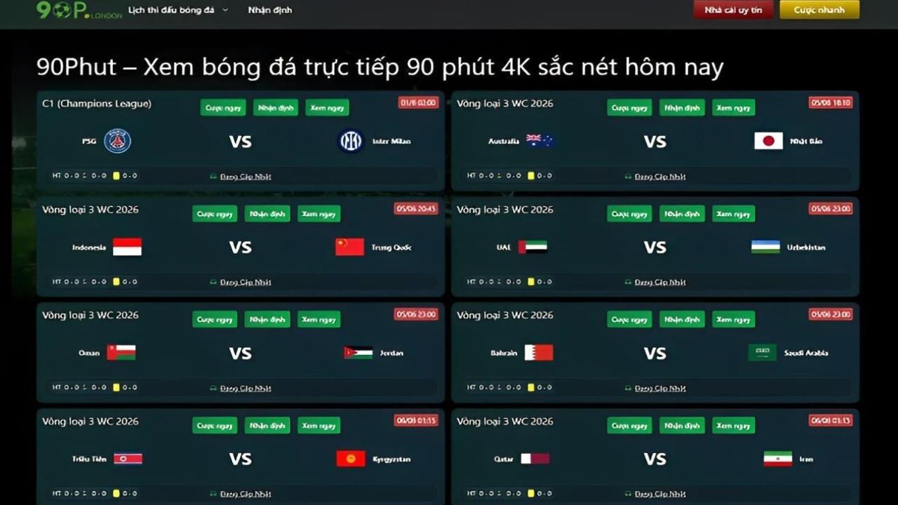 90phut TV trực tiếp bóng đá hàng đầu Việt Nam, chất lượng hình ảnh cao, âm thanh sôi động, BLV tiếng việt các giải bóng đá Anh, Laliga, C1, Euro,...