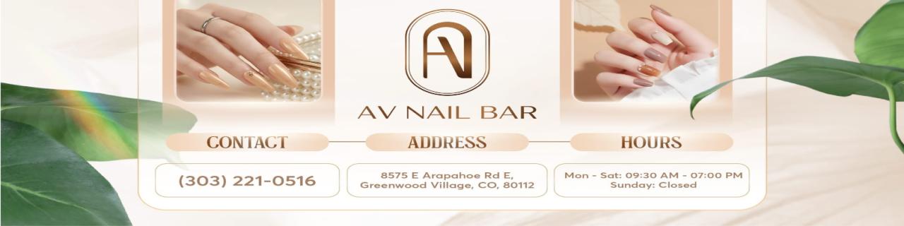 AV Nail Bar – Nail Salon in E Arapahoe Rd E, Greenwood Village, CO 80112. We provide an upscale atmosphere where technical precision meets a warm, welcoming community spirit