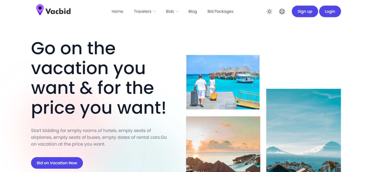 Go on the vacation you want & for the price you want! Start bidding for empty rooms of hotels, empty seats of airplanes, empty seats of buses, empty dates of rental cars.Go on vacation at the price you want. Budget hotel booking