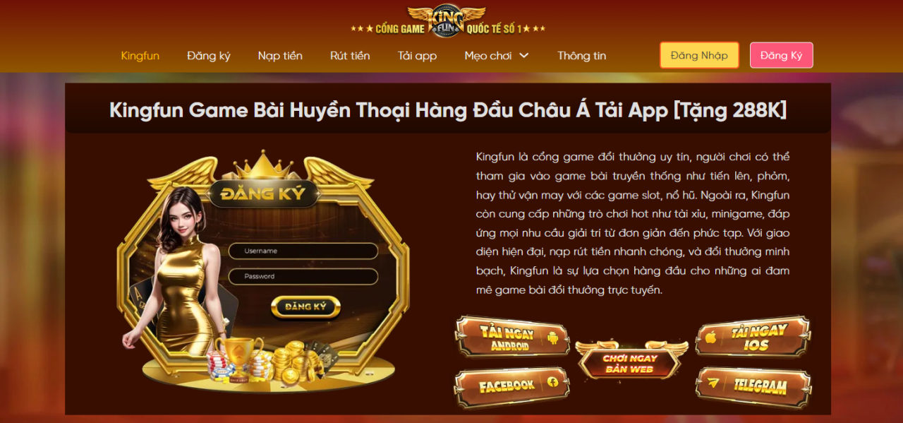 King fun huyền thoại game bài đổi thưởng [Tặng 288K] cực uy tín và đa dạng trò chơi như tiến lên, phỏm, hay thử vận may với các game slot, nổ hũ.