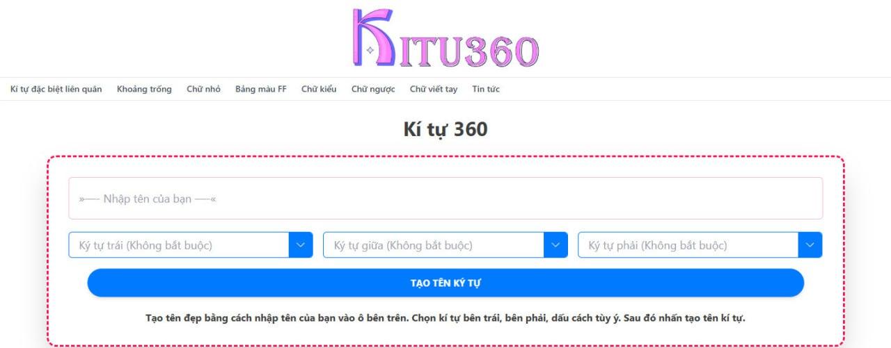 Muốn tên game khác biệt? Kí Tự Đặc Biệt 360 cung cấp kho ký tự đẹp, icon và mẫu tên cập nhật liên tục, chỉ cần nhập – chọn – copy. Tương thích Free Fire, Liên Quân, PUBG… tốc độ nhanh, chuẩn Unicode, cực dễ dùng. Ghé kitu360.com để trải nghiệm.
