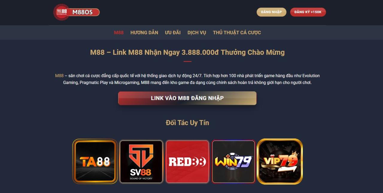 M88 là nền tảng cá cược hàng đầu châu Á, mang đến trải nghiệm đẳng cấp quốc tế với giao diện thân thiện, tích hợp ngôn ngữ tiếng Việt và hỗ trợ trên mọi thiết bị. Được thành lập từ năm 2003 và sở hữu bởi Mansion Limited, M88 hoạt động hợp pháp dưới sự giám sát của cơ quan Cagayan Economic Zone Authority (CEZA), Philippines. Nổi bật với hơn 100 nhà phát triển game như Evolution Gaming và Microgaming, M88 cung cấp đa dạng các sản phẩm từ cá cược thể thao, casino trực tuyến, đến game bài thuần Việt.Là đối tác chiến lược của nhiều đội bóng lớn như Tottenham Hotspur, Manchester City, và giải đấu La Liga, M88 khẳng định uy tín và tiềm lực tài chính mạnh mẽ. Điểm nhấn của M88 là chính sách khuyến mãi hấp dẫn, hỗ trợ 24/7, giao dịch nhanh chóng, cùng các công cụ phân tích kèo chuyên sâu. Với hàng nghìn kèo cược mỗi tháng, sảnh casino đẳng cấp và các trò chơi hấp dẫn, M88 xứng đáng là lựa chọn số một cho mọi cược thủ.
