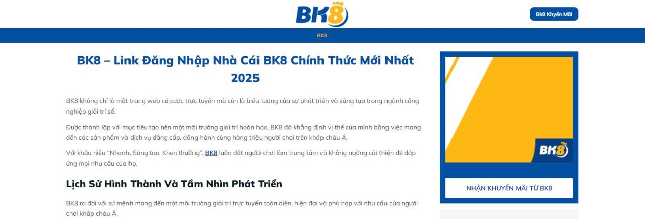 BK8 là nhà cái lâu đời đến từ châu âu và tại Việt Nam được người chơi ưu chuộng. Tại bk8 có các trò chơi cá cược thể thao, casino, slot game, bắn cá uy tín.