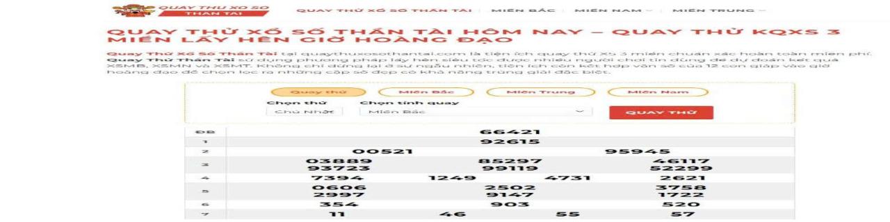 Quay Thử Xổ Số Thần Tài Giờ Hoàng Đạo là tiện ích quay thử XS 3 miền chuẩn xác hoàn toàn miễn phí. Quay Thử Thần Tài sử dụng phương pháp lấy hên siêu tốc...