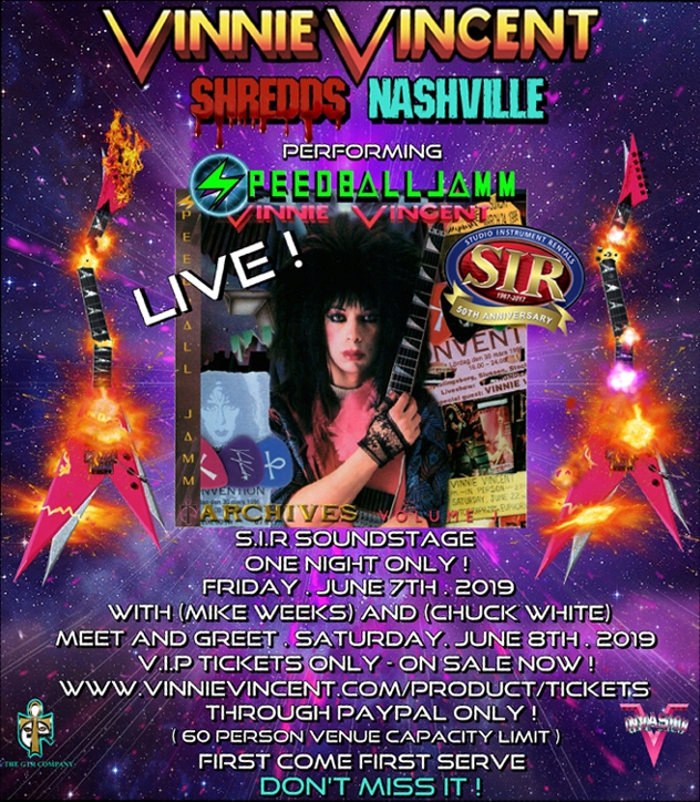 Each $300.00 VIP ticket will include the exclusive Vinnie Vincent "Speedballjamm" performance, a Vinnie Vincent meet-and-greet on Saturday, June 8 from 1 p.m. to 4 p.m. at the same S.I.R. soundstage (one autographed item; no guitars, parts, accessories or musical instruments, parts or accessories).